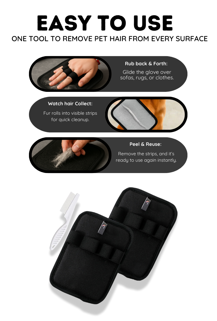 A: Simply slip the glove on and run your hand over couches, carpets, clothes, or bedding. The specially designed fabric grips pet hair, lint, and dust, gathering it into clumps that you can easily lift off and discard. No sticky residue, no damage, just a clean surface in seconds.